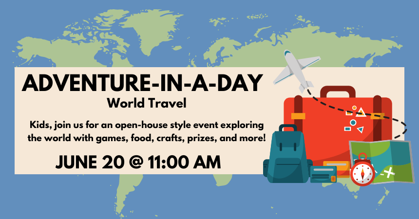 Thursday, June 20, 2024 | 11am to 12pm United States Thursday, June 20 at 11:00 am. Join us for an open-house style event exploring the world with games, food, crafts, prizes, and more! Audience Kids