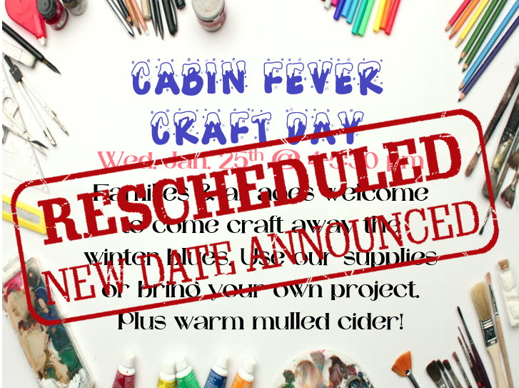 Come craft the winter blues away at the library this month! Families and people of all ages are invited to come to the library on Wednesday, January 25 anytime between 4:00 pm and 5:30 pm to craft and share warm cider together.
