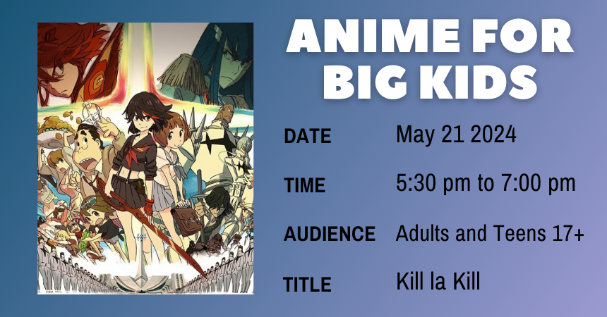 Tuesday, May 21, 2024 | 5:30 to 7pm United States At 5:30 pm on Tuesday, May 21, adults (and older teens) are invited to enjoy anime that’s more at their level – and popcorn! This month check out the action hit Kill la Kill. Audience Adults Teens