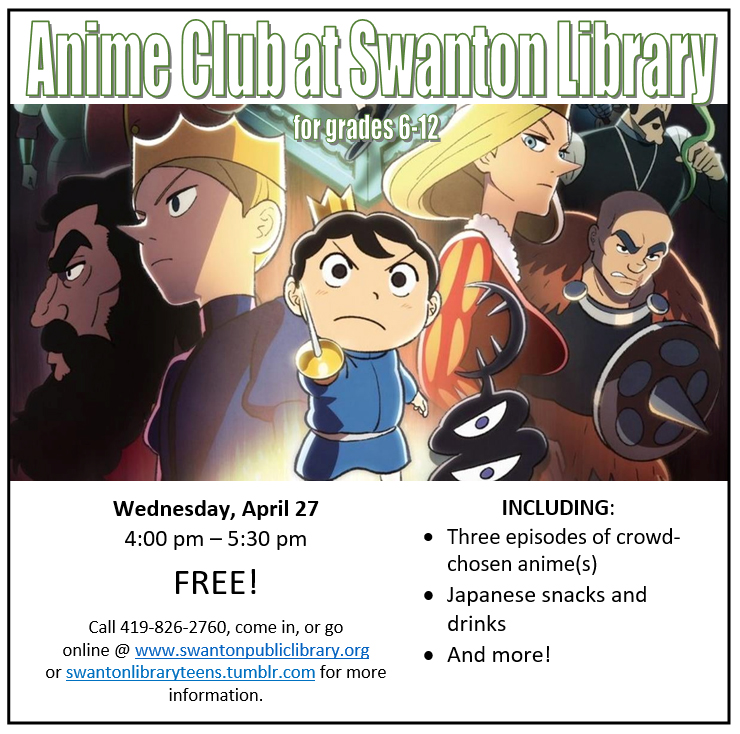 Join us from 4:00 pm to 5:30 pm on Wednesday, April 27 for an afternoon full of anime! Join us to watch three episodes of anime chosen by the attendees. Japanese snacks and drinks will also be provided. Open to grades 5-12. No registration needed.