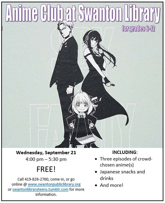 Come to the library from 4:00 pm to 5:30 pm on Wednesday, September 21, to watch three episodes of anime(s) chosen by the attendees. Snacks, Japanese and otherwise, and drinks will also be provided. No registration required. FREE!