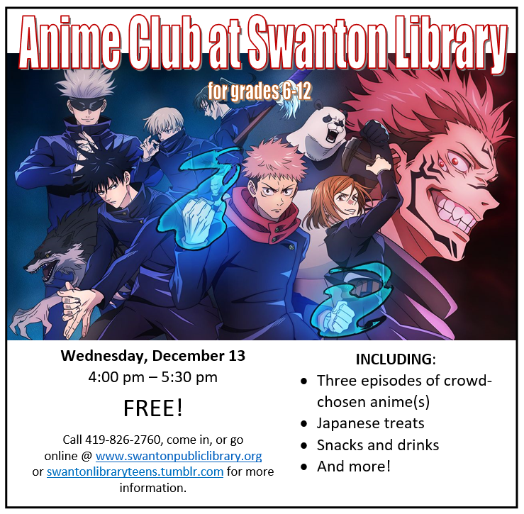 Wednesday, December 13, 2023 | 4 to 5:30pm United States Join us from 4:00 pm to 5:30 pm on Wednesday, December 13, to watch three episodes of anime chosen by the attendees. Snacks included! Audience Teens