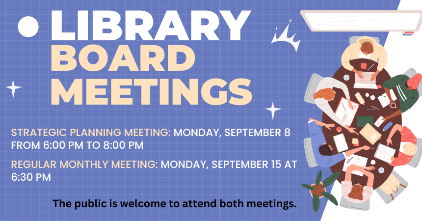 Monday, September 15, 2025 | 6:30 to 8:30pm United States The strategic planning meeting will be September 8 from 6:00 to 8:00 pm. The public is welcome. The next Board meeting is Monday, September 15 at 6:30 pm. The public is welcome to attend.