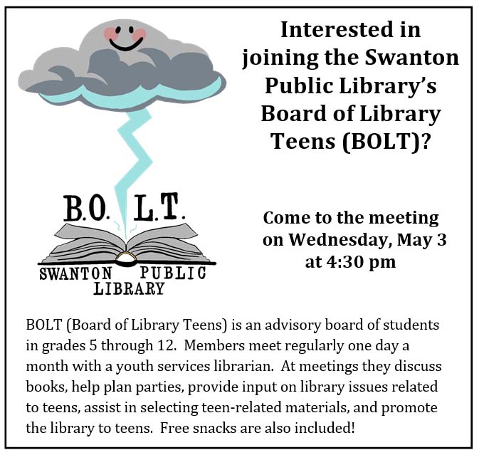 Wednesday, May 3, 2023 | 4:30 to 5:30pm United States Interested in joining BOLT (Board of Library Teens)? Come to the meeting at 4:30 pm on Wednesday, May 3. Help with book selection and planning events, and eat snacks! Open to grades 5-12. Audience Teens