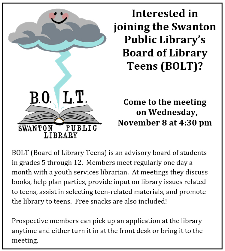 Interested in joining BOLT (Board of Library Teens)? Come to the next meeting at 4:30 pm on Wednesday, November 8. Pick up an application at the library and either turn it in at the front desk or bring it to the meeting. Members help with party planning and book selection, and eat snacks! Open to grades 5-12.