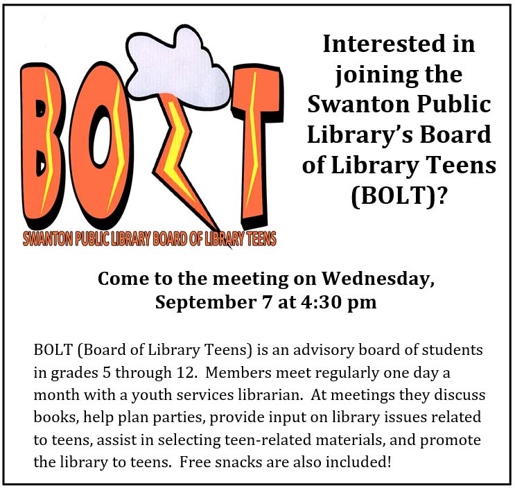 The library invites middle and high schoolers to participate in the Board of Library Teens (BOLT). The first meeting of the school year is at 4:30 pm on Wednesday, September 7. BOLT is an advisory board of students in grades 5-12. At meetings they discuss books, assist in planning programs, provide input on issues related to teens, and eat snacks!