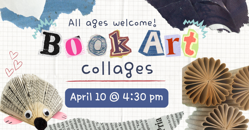 Thursday, April 10, 2025 | 4:30 to 5:30pm United States Make book art collages to celebrate National Library Week! Thursday, April 10 at 4:30 pm. All ages Audience Adults Kids Teens