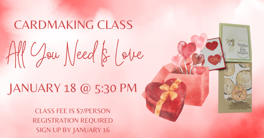 Cardmaking returns! Teacher Anna Geis will be here on Thursday, January 18 at 5:30 pm to show participants how to make three different cards with a love theme, including a wedding card. Class fee is $7/person; all supplies are provided. Please call or register online by January 16! Note that final results may not match the samples provided.