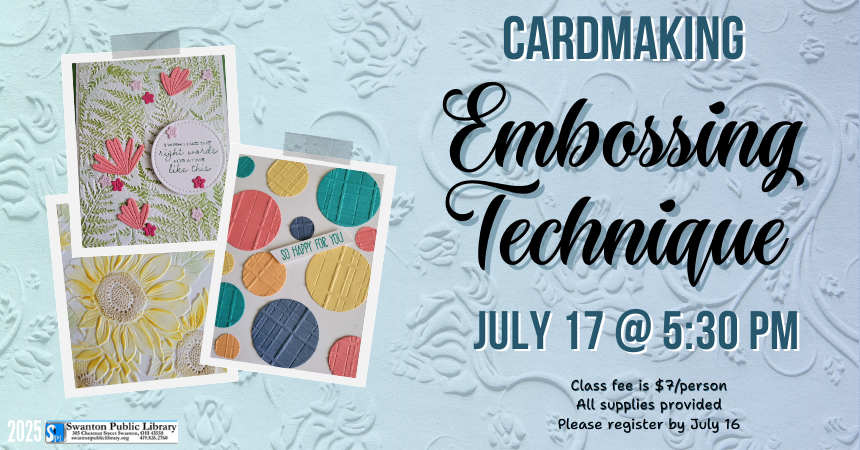 Join instructor Anna Geis at 5:30 pm on Thursday, July 17 to make three cards using the embossing technique! Class fee is $7/person; all supplies provided. Please register online or call by July 16!