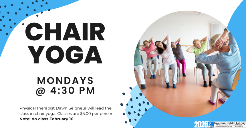 Monday, February 23, 2026 | 4:30 to 5:30pm United States Mondays at 4:30 pm. Physical therapist Dawn Seigneur will be here to lead a class in chair yoga. Classes are $5.00 per person. Registration is not required. Audience Adults