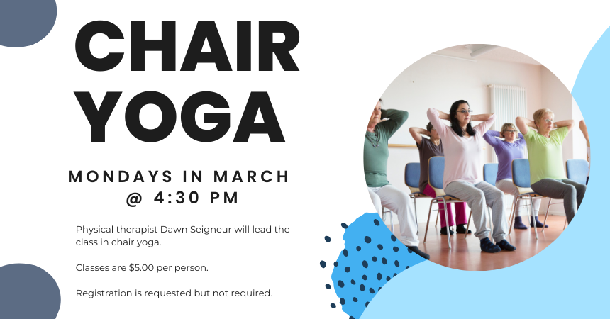 Interested in yoga but want something little easier to start with? Physical therapist Dawn Seigneur will be here on Mondays at 4:30 pm to lead a class in chair yoga. Classes are $5.00 per person. Registration is requested but not required; please visit our website or call to sign up.