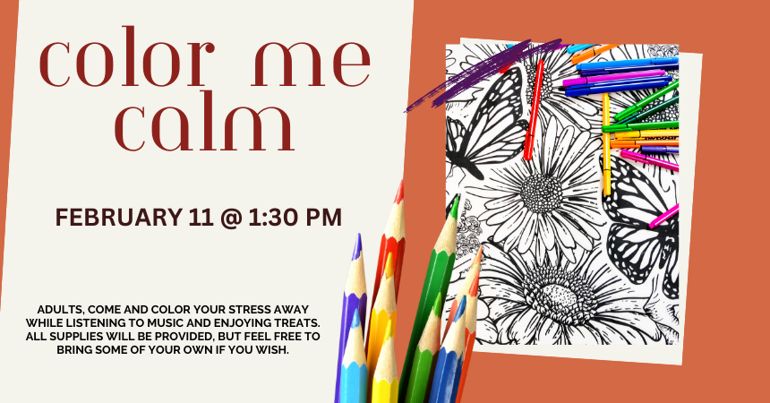 Tuesday, February 11, 2025 | 1:30 to 2:30pm United States Come color your stress away while listening to music and enjoying coffee or tea on Tuesday, February 11 at 1:30 pm. All supplies will be provided, but feel free to bring some of your own. Audience Adults