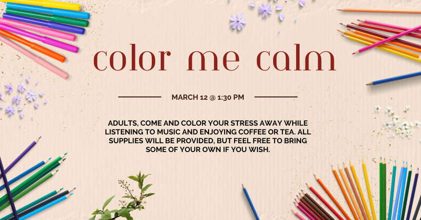 Adults, please come and color your stress away while listening to music and enjoying coffee or tea. Join us at the library at 1:30 pm on Tuesday, March 12. All supplies will be provided, but feel free to bring some of your own if you wish.