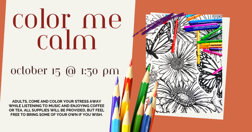 Tuesday, October 15, 2024 | 1:30 to 2:30pm United States Adults, please come and color your stress away while listening to music and enjoying coffee or tea. Join us on Tuesday, October 15 at 1:30 pm. All supplies provided. Audience Adults