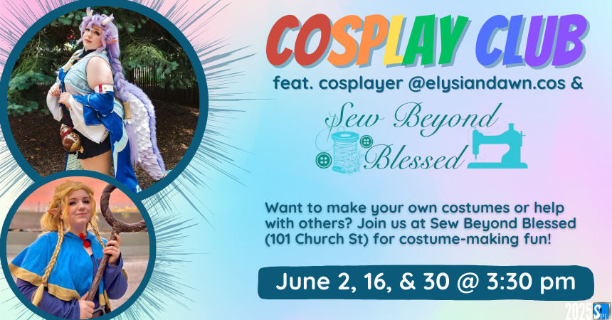 Mondays, June 2, 16, 30 & July 14 & 28 at 3:30 pm. Meet the cosplay club at Sew Beyond Blessed (101 Church Street) to work on your cosplays and with local cosplayer/seamstress @elysiandawn.cos.