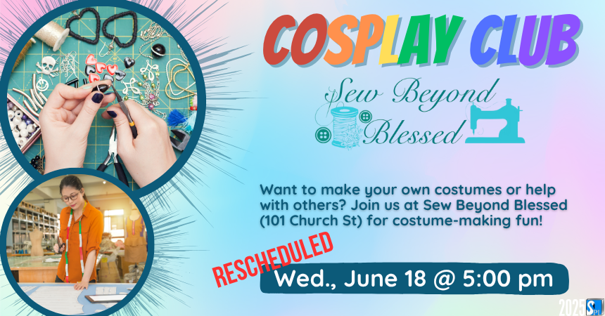 Wednesday, June 18, 2025 | 5 to 6pm 101 Church St Swanton, OH 43558 United States Wednesday, June 18 at 5:00 pm. Meet the cosplay club at Sew Beyond Blessed (101 Church Street) to work on your cosplays. Audience Teens