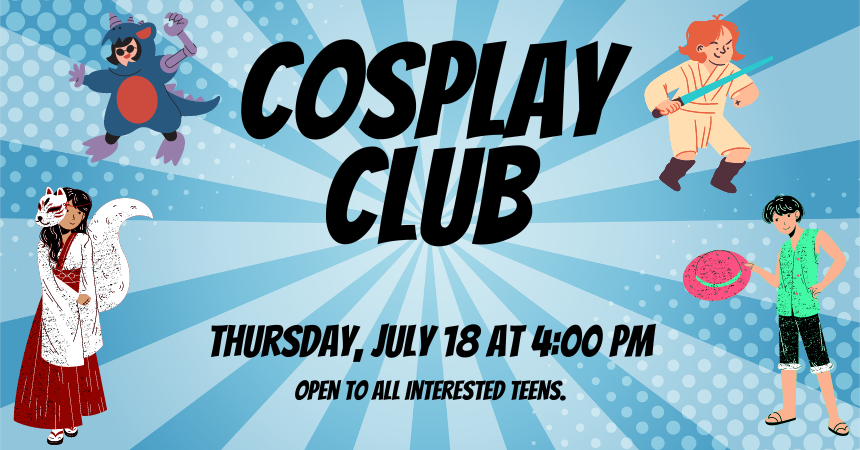 Thursday, July 18, 2024 | 4 to 5:30pm United States Cosplay Club – Thursday, July 18 at 4:00 pm. Want to make costumes or help with others? Join cosplay club! Audience Teens