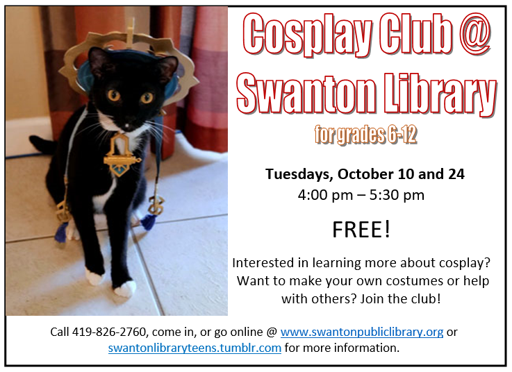 Tuesday, October 10, 2023 | 4 to 5pm United States Interested in learning more about cosplay? Want to make your own costumes or help with others? Join the club! Cosplay Club meets at the library at 4:00 pm on Tuesdays, October 10 and 24. Audience Teens