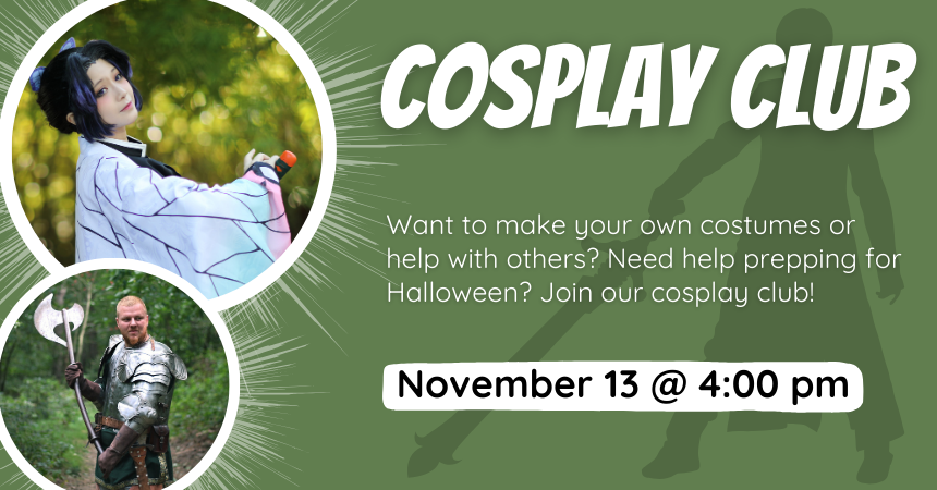 Wednesday, November 13, 2024 | 4 to 5:30pm United States Wednesday, November 13 at 4:00 pm. Want to make your own costumes or help with others? Join the cosplay club! Audience Teens