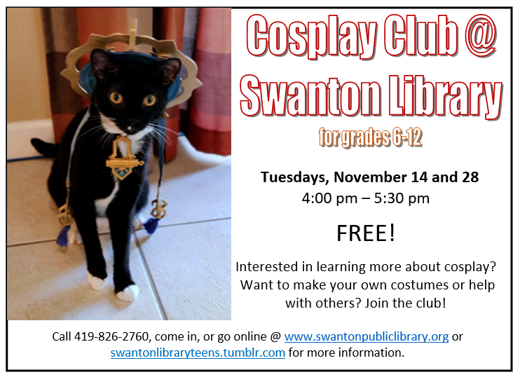 Tuesday, November 14, 2023 | 4 to 5:30pm United States Interested in learning more about cos-play? Want to make your own costumes or help with others? Join the club! Cosplay Club meets at the libra-ry at 4:00 pm on Tuesdays, November 14 and 28. Audience Teens