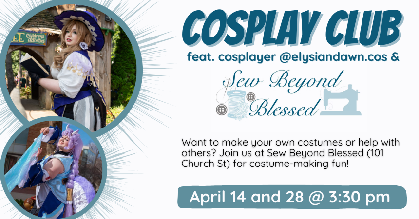 Cosplay Club: Mondays, April 14 and 28 at 3:30 pm. Meet the cosplay club at Sew Beyond Blessed (101 Church Street) to work on your cosplays and learn more about sewing with local cosplayer and seamstress @elysiandawn.cos.