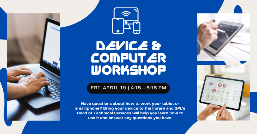 Have questions about how to work your tablet or smartphone? Bring your device to the library at 4:15 pm on Friday, April 19 and SPL’s Head of Technical Services will help you learn how to use it and answer any questions you have.