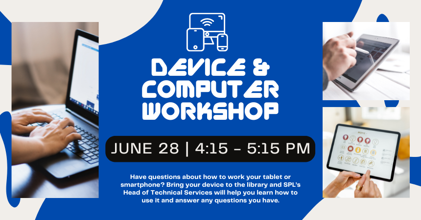 Have questions about how to work your tablet or smartphone? Bring your device to the library at 4:15 pm on Friday, June 28 and SPL’s Head of Technical Services will help you learn how to use it and answer any questions you have.