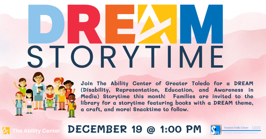 Join The Ability Center of Greater Toledo for a DREAM (Disability, Representation, Education, and Awareness in Media) Storytime this month! Families are invited to the library at 1:00 pm on Thursday, December 19 for a storytime featuring books with a DREAM theme, a craft, and more! Snacktime to follow.