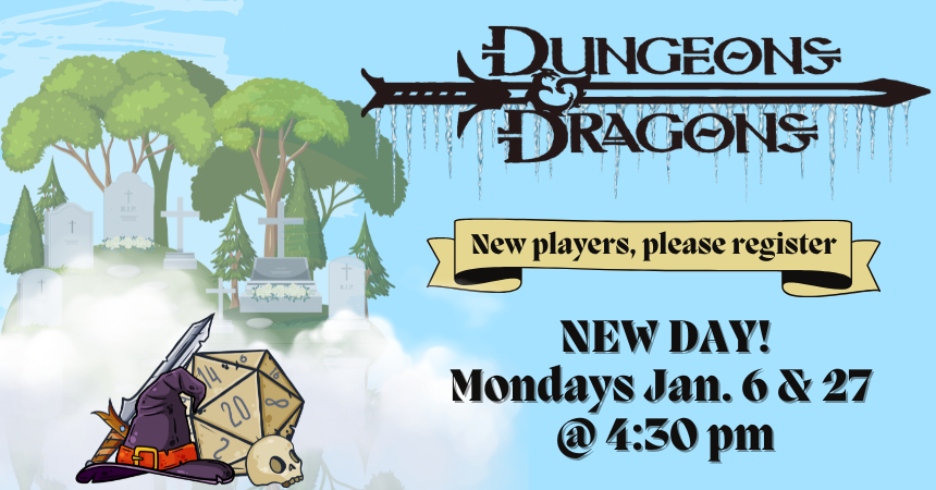 NEW TIME! Mondays, January 6 and 27 at 4:30 pm. Please bring a 5th edition third-level character sheet if possible; pre-generated characters will also be available. New players, please register online.
