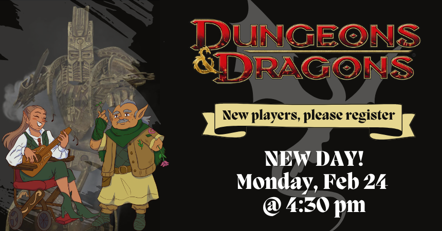 Monday, February 24, 2025 | 4:30 to 6:30pm United States Monday, February 24 at 4:30 pm. Please bring a fifth edition third-level character sheet if possible; pre-generated characters will also be available. New players, please register online. Register Audience Adults Teens