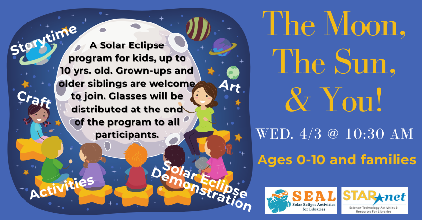 Thanks to a grant from S.E.A.L./StarNet, free eclipse glasses will be given out at these programs. Any remaining glasses can be picked up at the library on April 5 and 6.