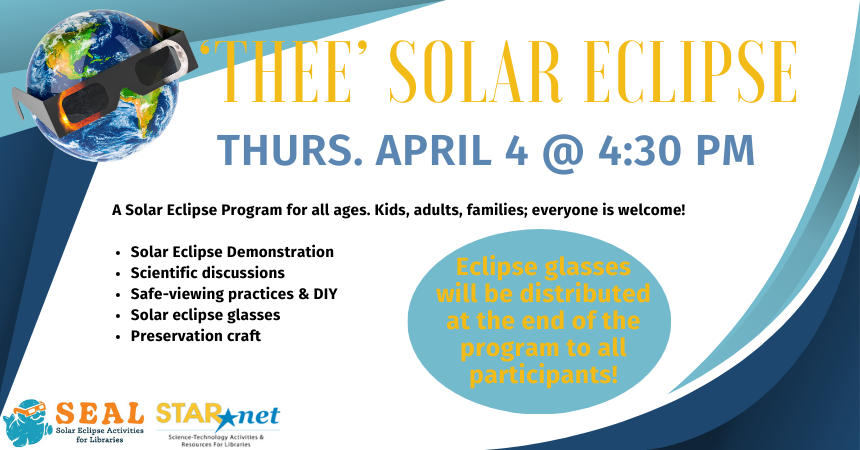 Thanks to a grant from S.E.A.L./StarNet, free eclipse glasses will be given out at these programs. Any remaining glasses can be picked up at the library on April 5 and 6.