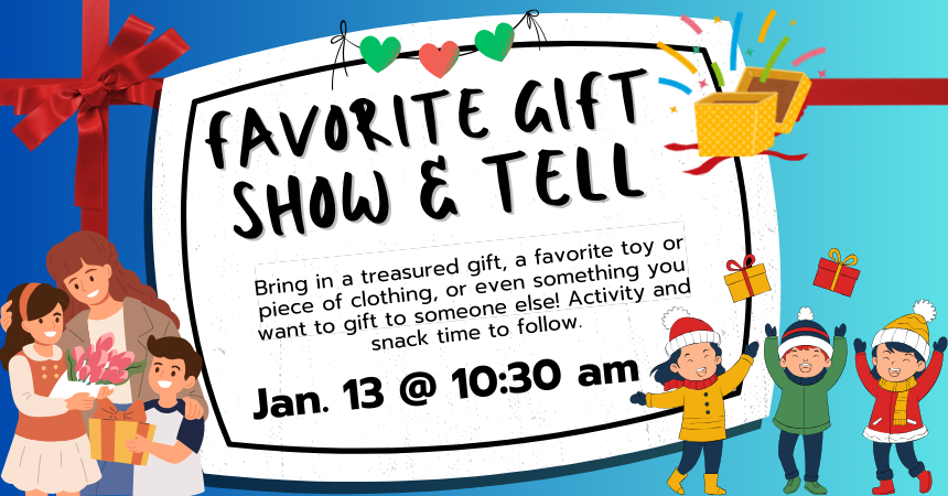 Show & Tell is moving earlier! Families are invited to join us at 10:30 am on Monday, January 13 for a Favorite Gift Show & Tell. Bring in a treasured gift, your favorite recent gift, or even something you want to gift to someone else! Craft and snack time to follow.