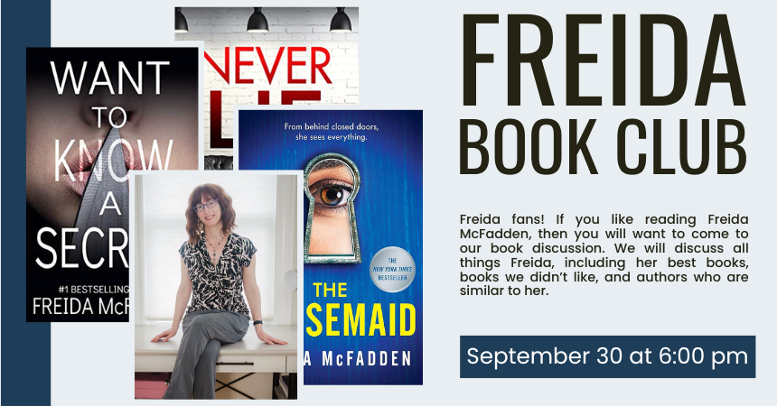 Freida fans! If you like reading Freida McFadden, then you will want to come to our book discussion on Monday, September 30 at 6:00 pm. We will discuss all things Freida, including her best books, books we didn’t like, and authors who are similar to her.