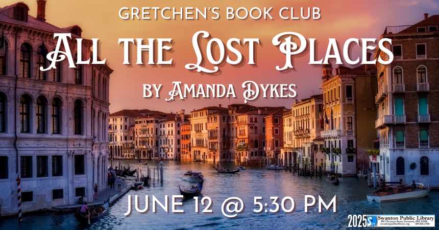 Gretchen’s Book Club: Join the local book club at 5:30 pm on Thursday, June 12 to discuss All the Lost Places by Amanda Dykes. “Discovered floating in a basket along the canals of Venice, Sebastien Trovato wrestles with questions of his origins. Decades later, on an assignment to translate a rare book, Daniel Goodman finds himself embroiled in a web of secrets carefully kept within the ancient city and in the mystery of the man whose story the book does not finish: Sebastien,” (All the Lost Places, 2022).