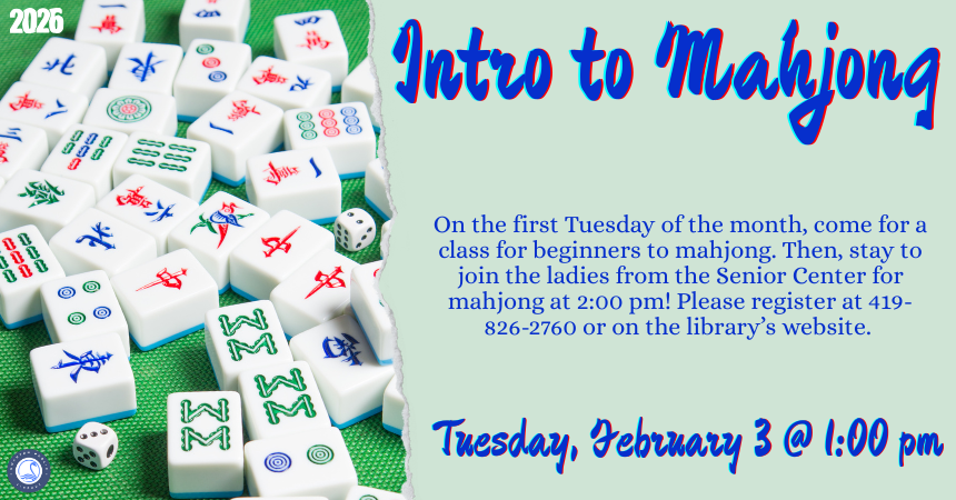 Tuesday, February 3, 2026 | 1 to 2pm United States On February 3, beginners are invited to register for a class at 1:00 pm to learn more about Mahjong and how to play! Call the library at 419-826-2760 or visit our website to register. Register! Audience Adults
