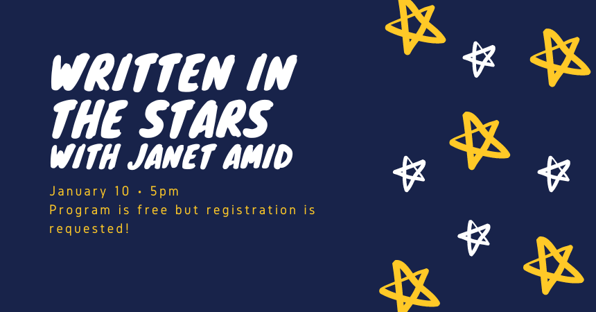 Janet Amid is returning to SPL! From 5:00 pm to 7:00 pm on Tuesday, January 10, Toledo’s favorite astrologer will talk to us about astrology, dreams, and her own predictions for 2023. Five audience members will also receive a ‘mini astrological profile’; birthdays and time of birth are needed for these! Stop in, call, or register through our website for this free program as soon as you can!