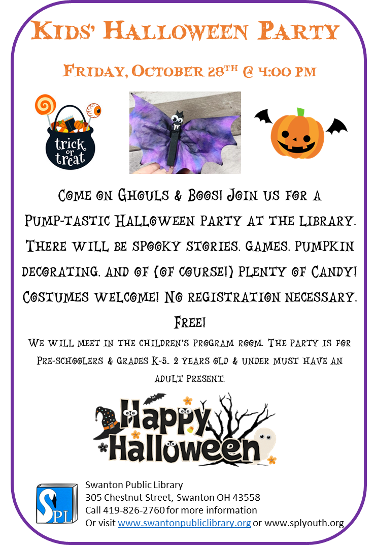 Come party for Halloween at the library! Preschoolers and grades K-5 are invited to celebrate at the library on Friday, October 28 at 4:00 pm. There will be spooky stories, games, pumpkin decorating, and (of course!) plenty of candy. Costumes welcome! No registration necessary. Free!
