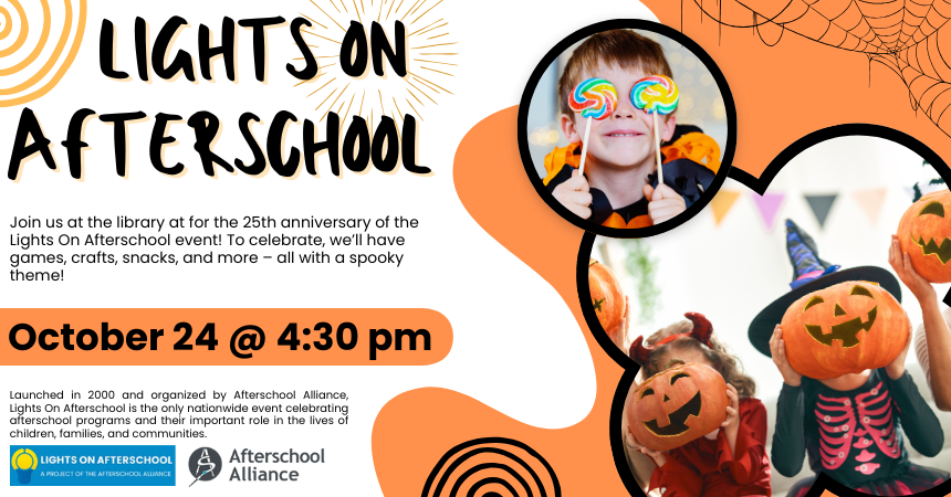 Join us at the library at 4:30 pm on Thursday, October 24 for the 25th anniversary of the Lights On Afterschool event! To celebrate, we’ll have games, crafts, snacks, and more – all with a spooky theme. Launched in 2000 and organized by Afterschool Alliance, Lights On Afterschool is the only nationwide event celebrating afterschool programs and their important role in the lives of children, families, and communities.