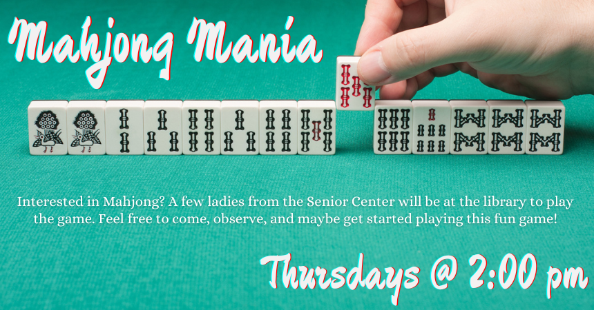 Interested in Mahjong? A few ladies from the Senior Center will be at the library on Thursdays in May at 2:00 pm to play the game. Feel free to come, observe, and maybe get started playing this fun game.