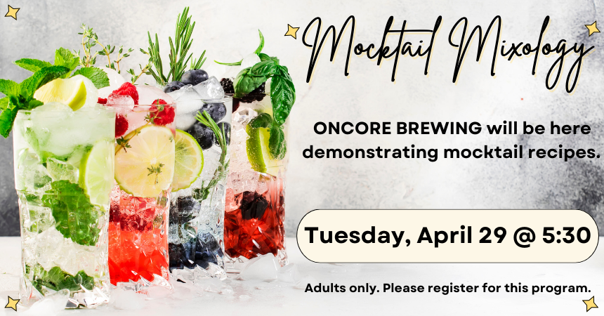 It’s here! A bartender from Oncore Brewing will visit SPL at 5:30 pm on Tuesday, April 29 to demonstrate the makings of a few delicious alcohol-free drinks! Adults only, please. Call, stop in, or register online by April 25.