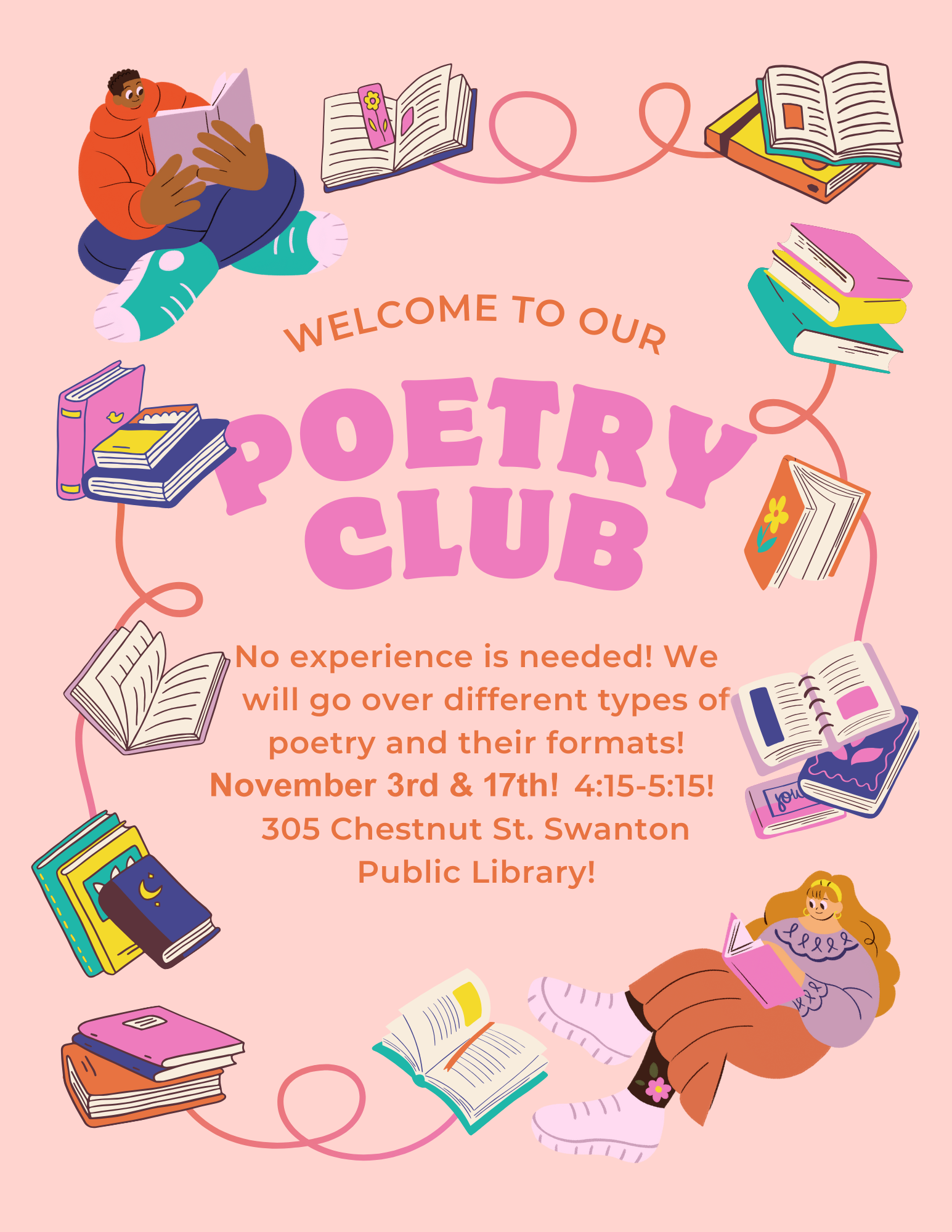 Friday, November 3, 2023 | 4:15 to 5:15pm United States NEW! Poetry Club for Teens: Calling all poets! Come to the library from 4:15 pm to 5:15 pm on Fridays, November 3 and 17 to discuss all types of poetry and how to write them. Free! Audience Teens