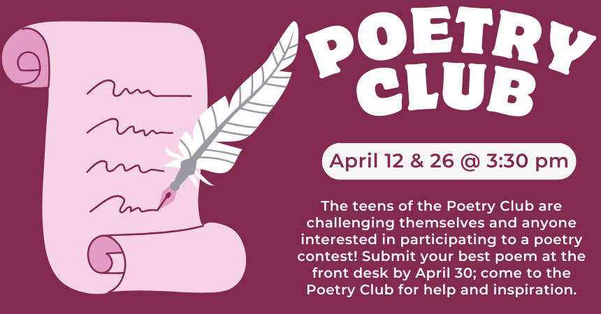 Poetry Contest: The teens of the Poetry Club are challenging themselves and anyone else interested in participating to a poetry contest! Submit your best poem at the front desk by April 30; come to the Poetry Club for help and inspiration on April 12 and 26.