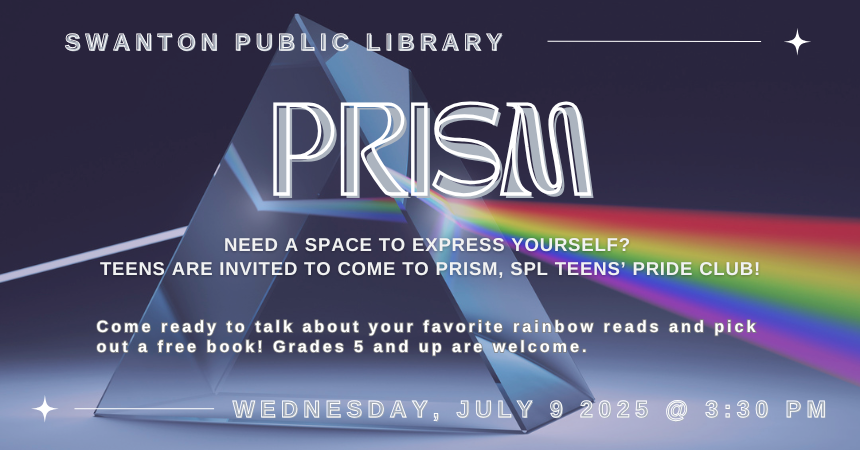 Wednesday, July 9, 2025 | 3:30 to 4:30pm United States Wednesday, July 9 at 3:30 pm. Need a place to express yourself? Come ready to play games and discuss favorite rainbow reads. Free books! Audience Teens