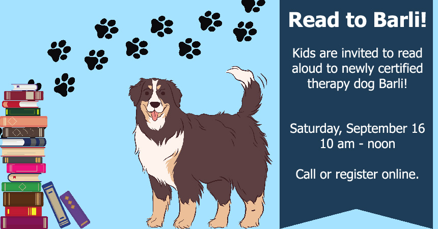 Sign up to read aloud to a therapy dog! Newly certified therapy dog Barli will be back on Saturday, September 16 from 10:00 am to noon. Six 20-minute slots are available. Call, come in, or register online.