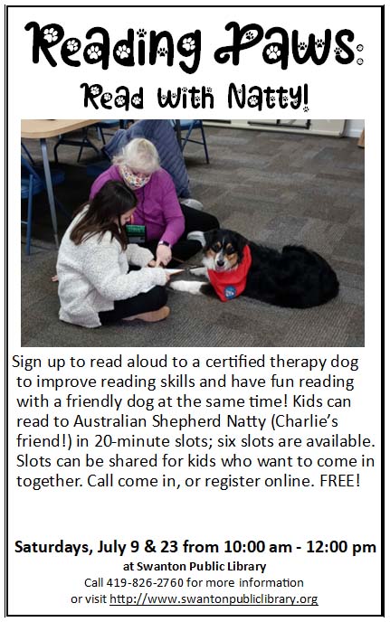 Sign up to read aloud to a certified therapy dog! Australian shepherd and therapy dog Natty will be here from 10:00 am to noon on Saturdays, July 9 and 23. Six 20-minute slots are available. Call, come in, or register online as soon as you can!