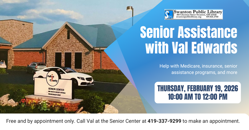 Val Edwards from the Fulton County Senior Center will be at the library to help walk you through topics such as Medicare, insurance, senior assistance programs, and more! Call Val at the Senior Center at 419-337-9299 to schedule an appointment for Thursday, February 19 between 10:00 am to noon. This is a free service and is by appointment only.