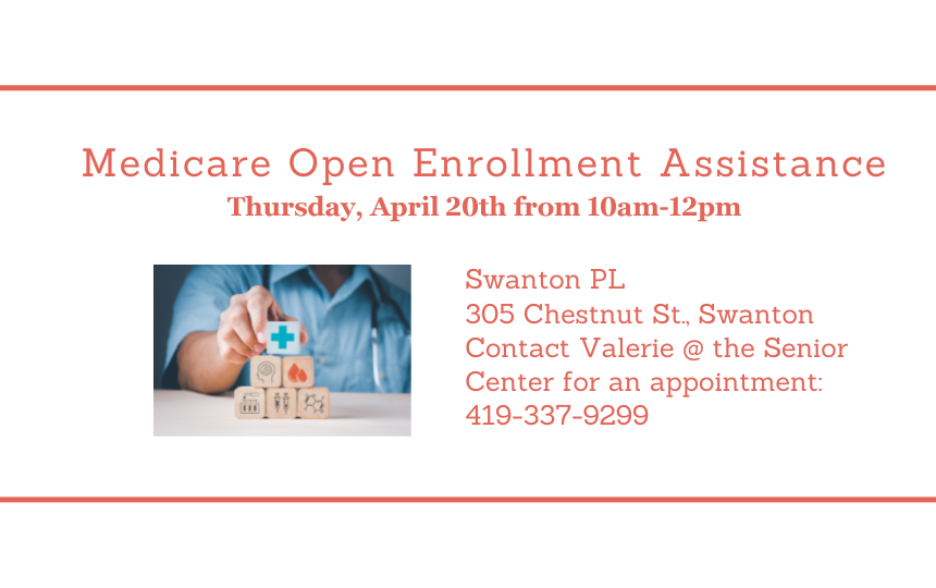 Val Edwards from the Fulton County Senior Center will be at the library on Thursday, April 20 from 10:00 am to noon to help with topics such as Medicare, senior assistance programs, and insurance. Call 419-337-9299 to schedule a free appointment.
