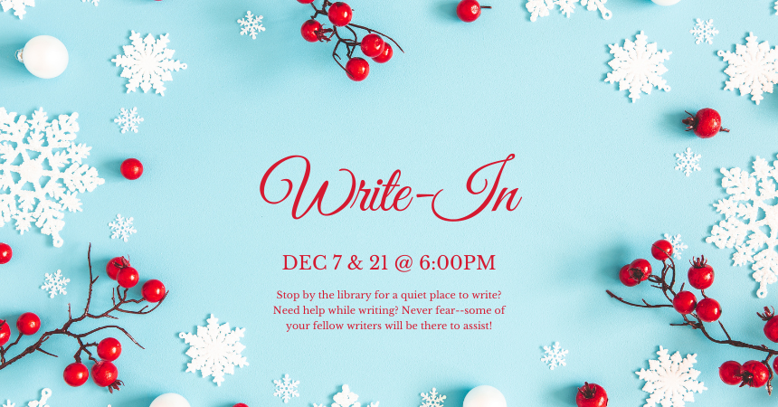 Thursday, December 7, 2023 | 6 to 8pm United States On off Thursdays from the Writers' Group, December 7 and 21 at 6:00 pm, enjoy a quiet space in the library to write. Audience Adults