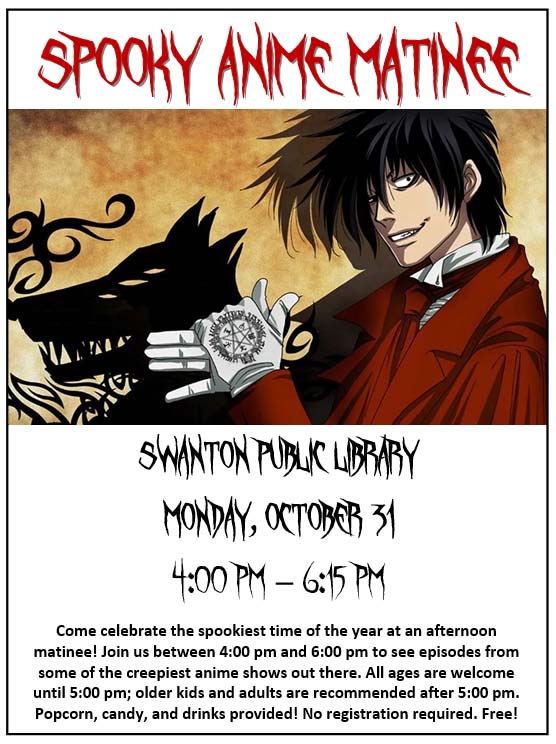 Come celebrate the spookiest time of the year at an afternoon matinee! Join us between 4:00 pm and 6:00 pm on Monday, October 31, to see episodes from some of the creepiest anime shows out there. All ages are welcome until 5:00; older kids and adults are recommended after 5:00. Popcorn, candy, and drinks provided! No registration required. FREE!